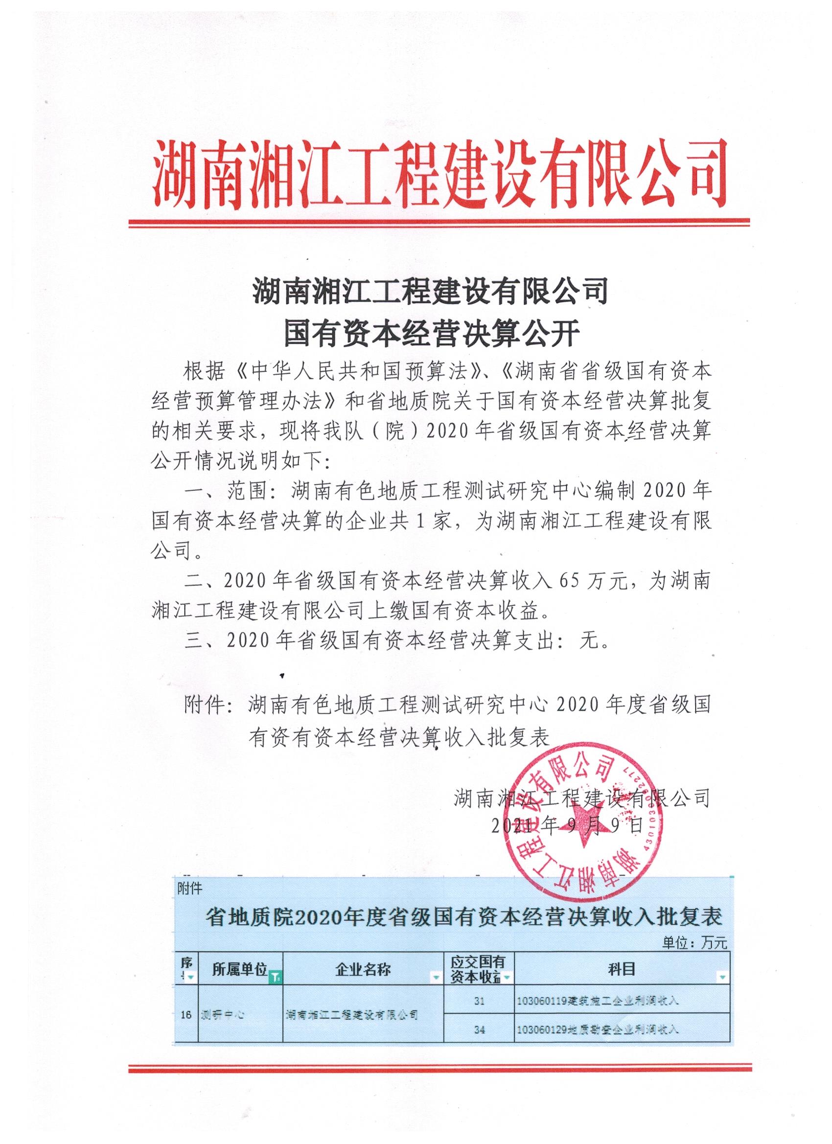 湖南湘江工程建設有限公司國有資本經營決算公開