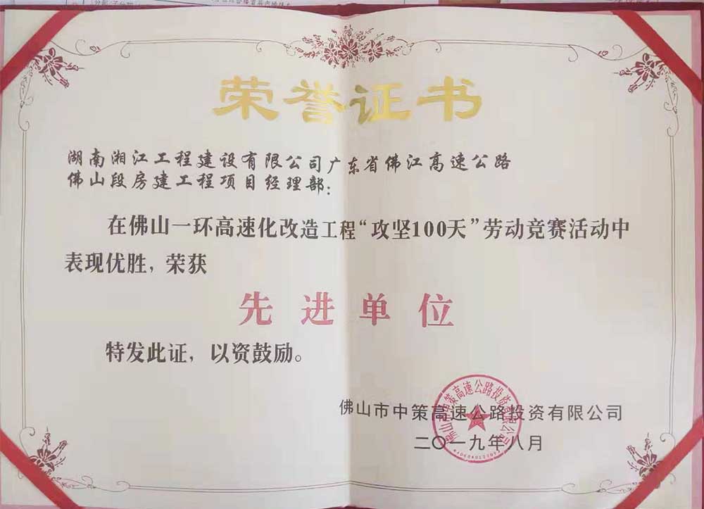 近期,由公司承建的佛山高速公路佛山段房建工程項目部在佛山一環(huán)高速化改造工程開展的“攻堅100天”勞動競賽活動中表現(xiàn)優(yōu)異,以高質量的工作成績力超中國鐵建等三家參建企業(yè),榮獲業(yè)主單位頒發(fā)的先進單位榮譽稱號。